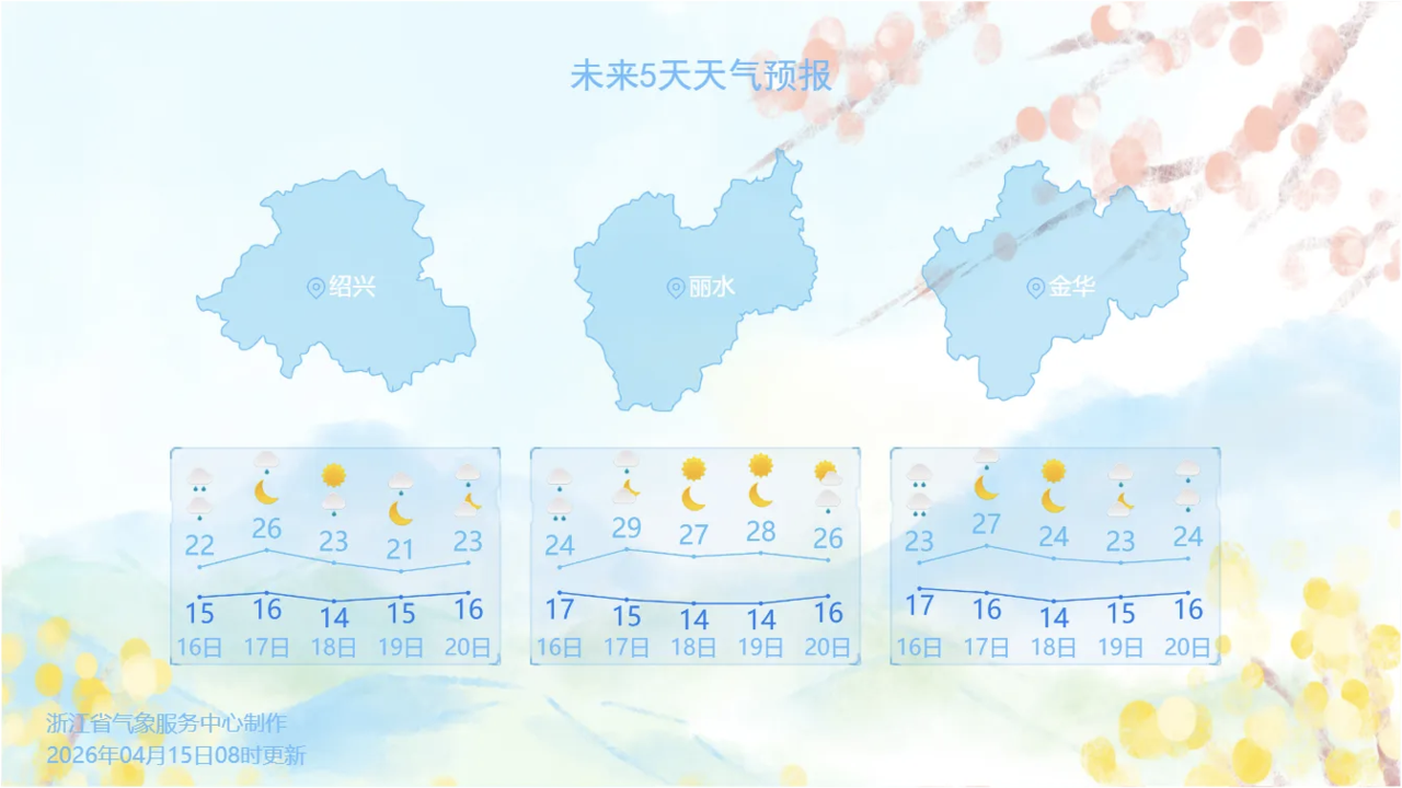 春雨绵绵数日后,昨天(4月15日),浙江终于迎来一个温柔的间歇——大部以多云和阴天打底,气温纷纷来到20℃以上,尽显江南春日的温润质感。