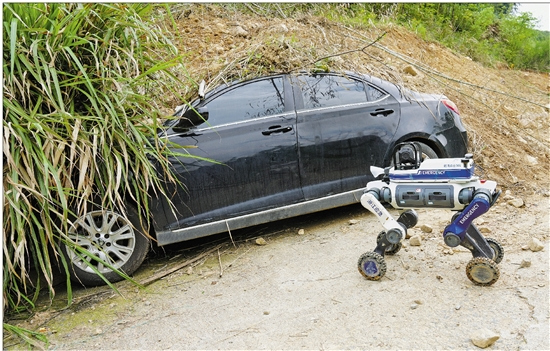 在车辆被掩埋场景的演习中,机器狗正在识别险情。 通讯员 马丁 摄