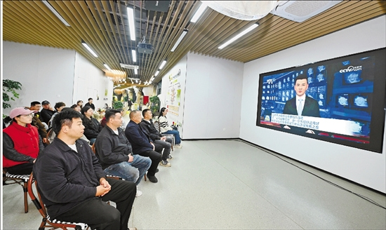 4月23日,金华市国际陆港产业发展有限公司职工在收看《新闻联播》。通讯员 胡肖飞 摄