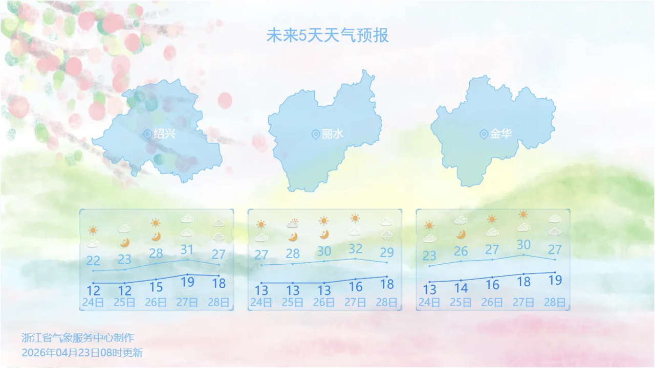 浙江省气象台表示,这波晴好天气预计将维持四天左右,我们的体感也将从晴暖转变到晴热。其中,26日至28日全省最高气温将冲击30℃大关,比如丽水,或将达到32℃。