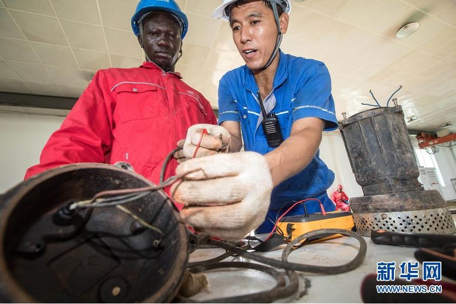 污水处理厂的中国员工向当地工人传授维修技巧|新华社
