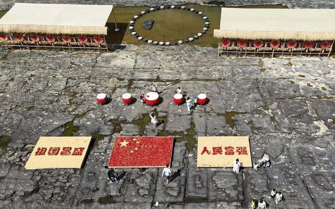 10月1日,温州市泰顺县南浦溪天然石壁晒场,农民将辣椒摆成五星红旗和“祖国昌盛”等字样,欢度国庆节 图源:潮新闻客户端