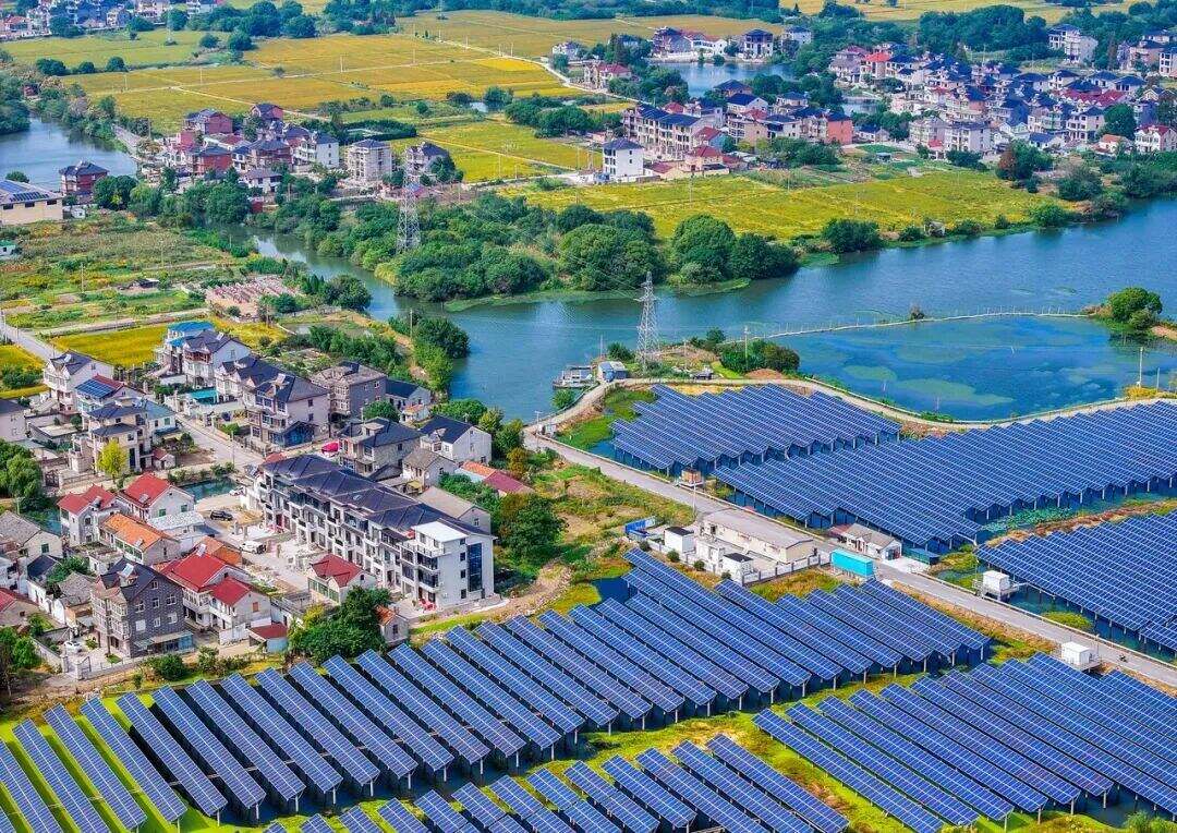 湖州市长兴县洪桥镇的渔光互补光伏发电站与村庄共绘出一幅美丽画卷 图源:潮新闻客户端