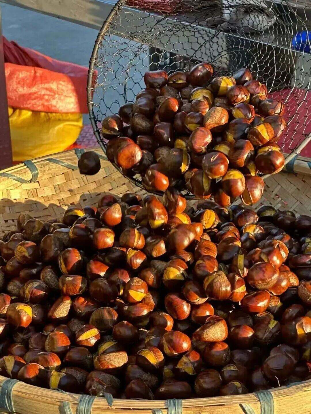 山里的孩子最盼霜降,那时栗壳自然炸开,一颗颗栗子掉在地上,在落叶上“吧嗒”作响。大人背着竹筐,孩子提着小篮,把新栗一一拣起。等到一筐筐栗子背回家,摊在院子里晾干,有的用柴火慢烤,有的在灶上热炒,便成了最可口的零嘴。吃不完的栗子再挑去集市、铺子,或卖给做糖炒栗子的师傅,于是,这些来自山林的果实便开始了另一段温热的人间旅程。