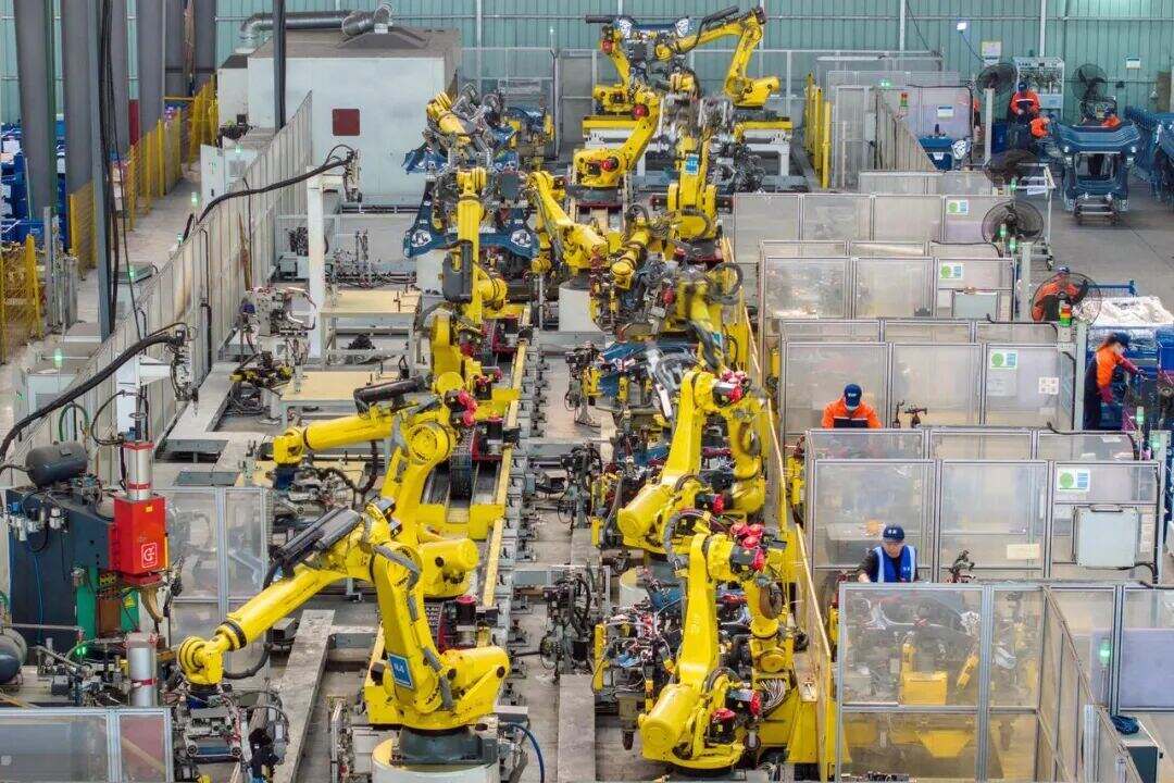 长兴县吕山乡的某汽车零部件有限公司,机器人高速运转,工人在自动化生产线上赶制新能源汽车零部件订单产品 图源:潮新闻客户端
