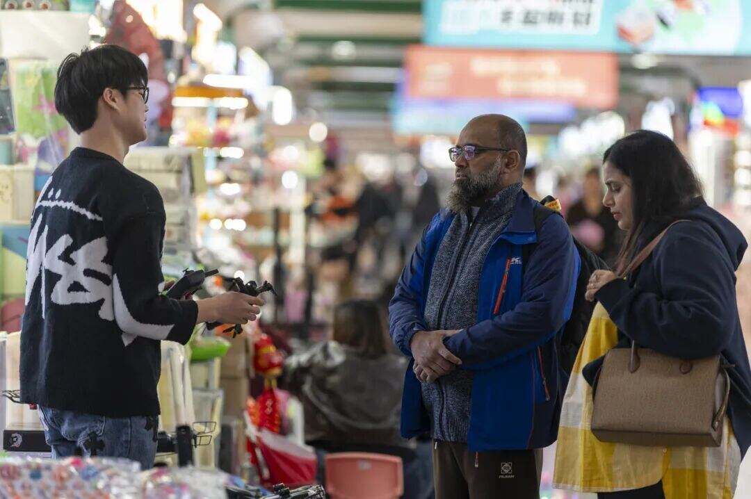义乌国际商贸城里,外国客商在洽谈采购商品 图源:潮新闻客户端